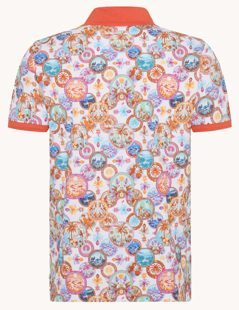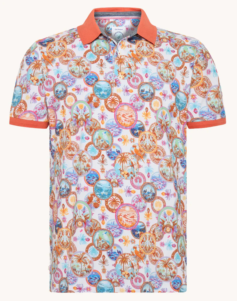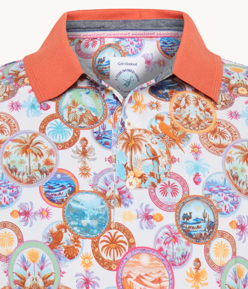 The A Fish Named Fred Polo Desert World in Orange features a bold, all-over desert landscape print that adds a playful edge to your look. Made from a soft and stretchy blend of 95% organic cotton and 5% elastane, it offers a modern, slightly tailored fit. Finished with a contrast collar and branded buttons, this polo delivers comfort, style, and standout personality in one.