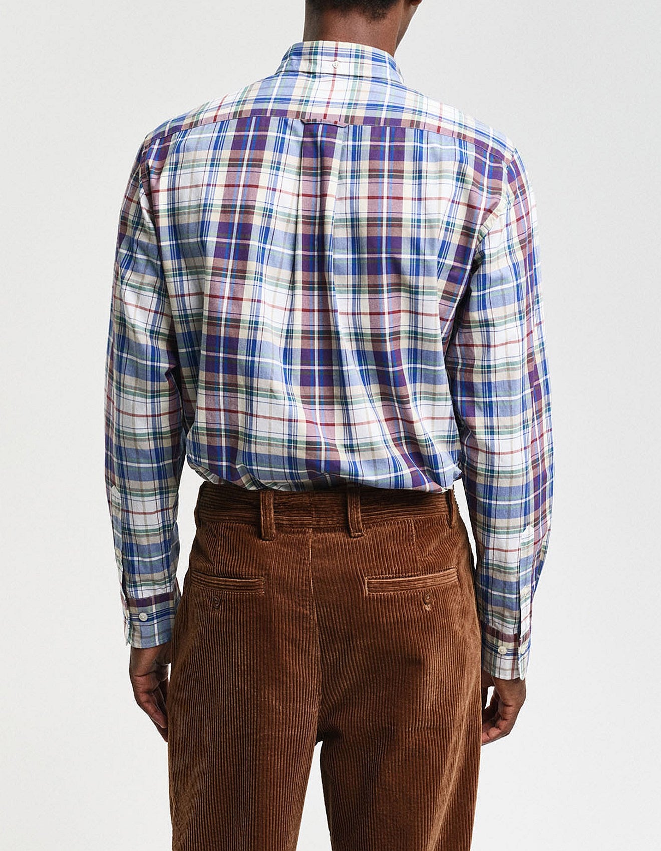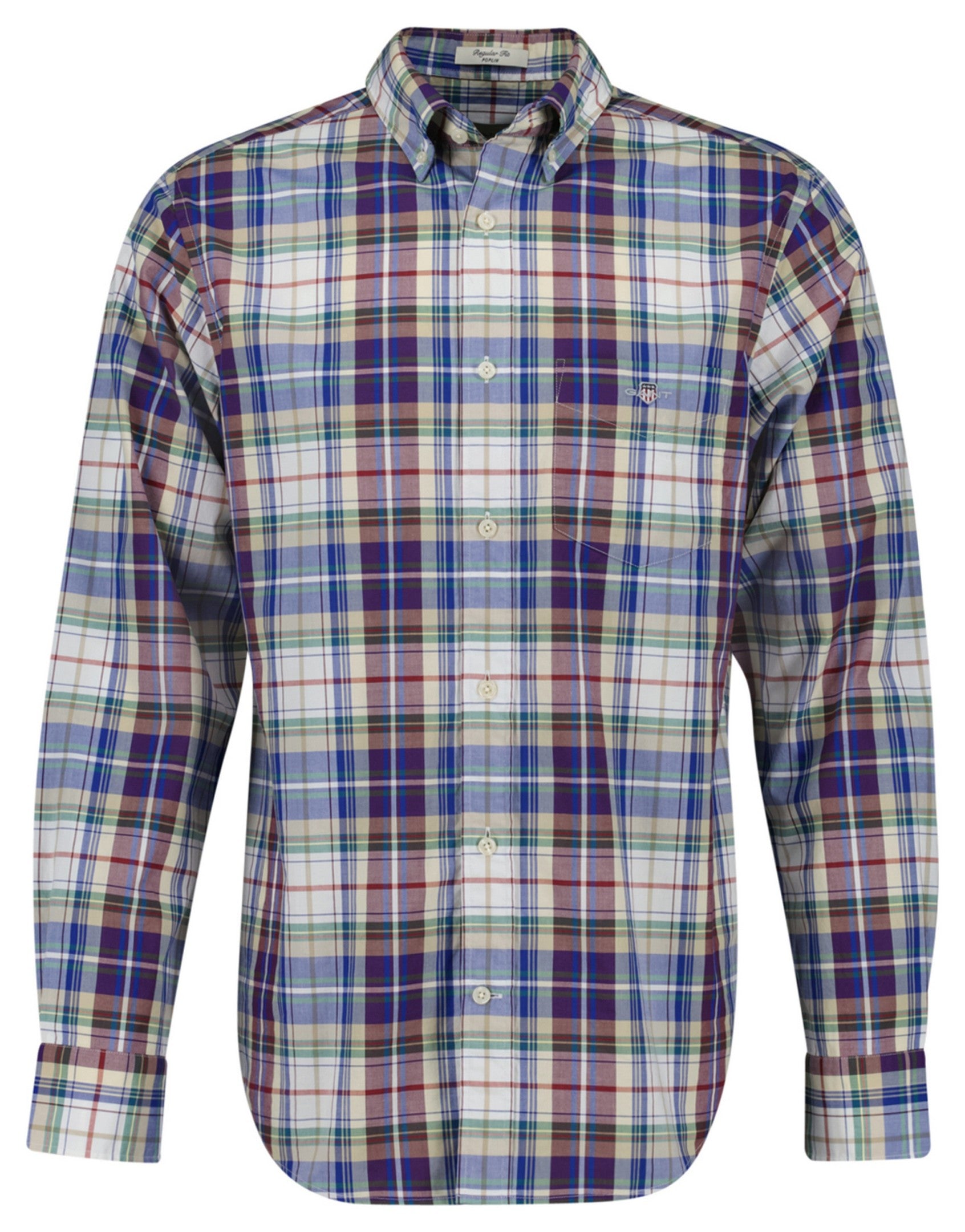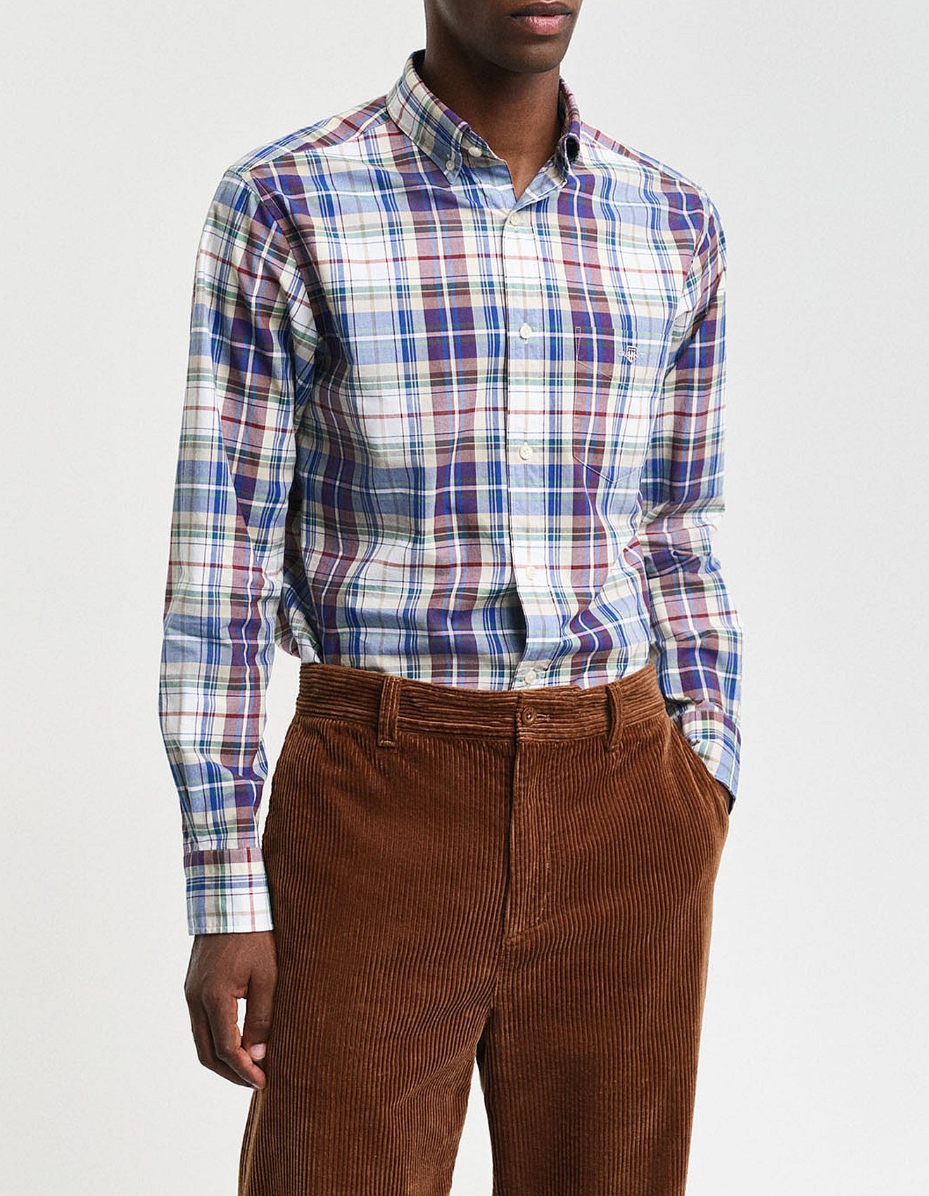 Crafted from 100% cotton and cut for a regular fit, this poplin shirt features an all-over checked pattern. Constructed with a classic button-down collar, the shirt is designed with a curved hem and adjustable sleeve cuffs. Detailed with a GANT shield graphic embroidered at the chest pocket, the design is complete with recycled polyester buttons and a box pleat with our signature locker loop at the back.