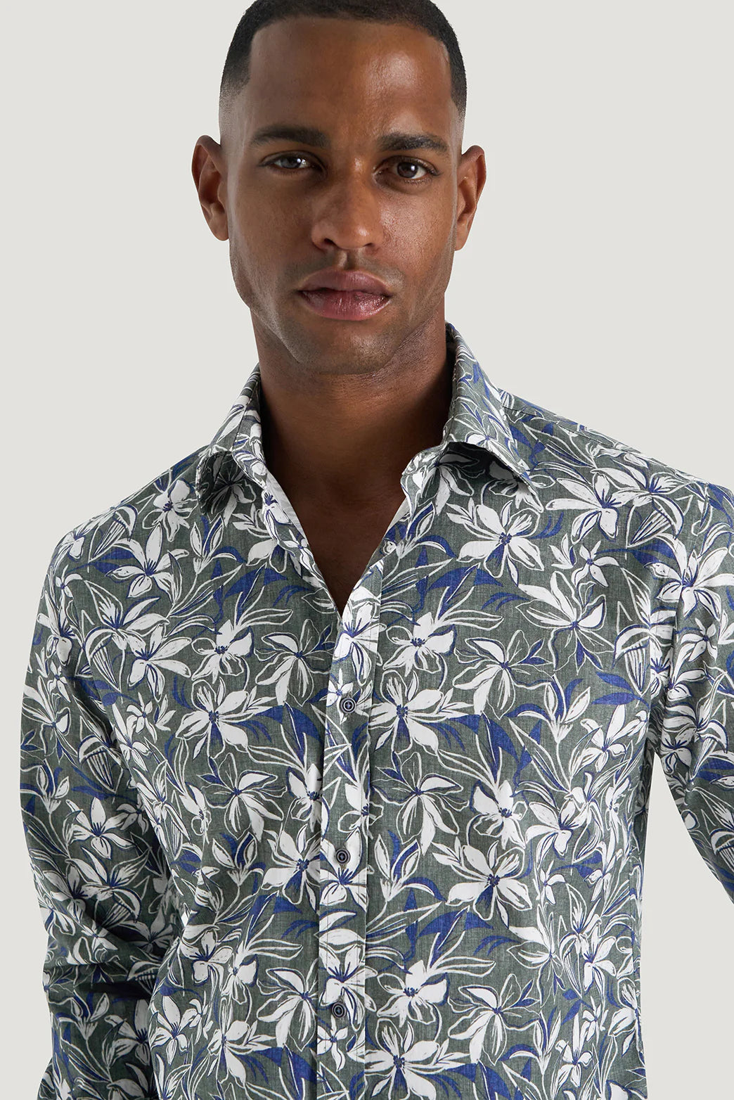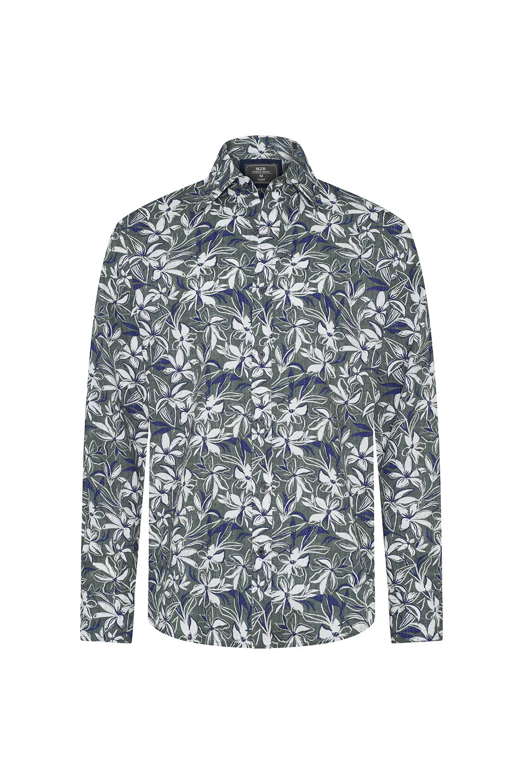 Crafted from M.J. Bale’s exclusive 100% cotton twill using extra-long staple yarns, the Marcello Floral Shirt is tailored in a relaxed Casual Fit and finished with a soft laundered handle for lived-in comfort. The seasonal floral print—rendered in green, navy, and white—was developed in collaboration with a Spanish textile artist whose Impressionist-inspired work evokes warmth, romance, and expressive movement. With a classic collar and removable stays, one-button cuff with four pleats, and a curved long tail, the shirt is constructed with single-needle French seams, reinforced gussets, and 18 stitches per inch. A refined take on florals, reimagined with boldness and character.