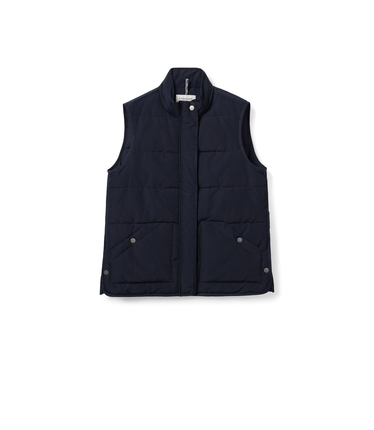 A versatile vest with a stand collar, two-way zipper, front patch pockets, and waist adjuster tabs, crafted from an organic cotton blend woven in Italy.