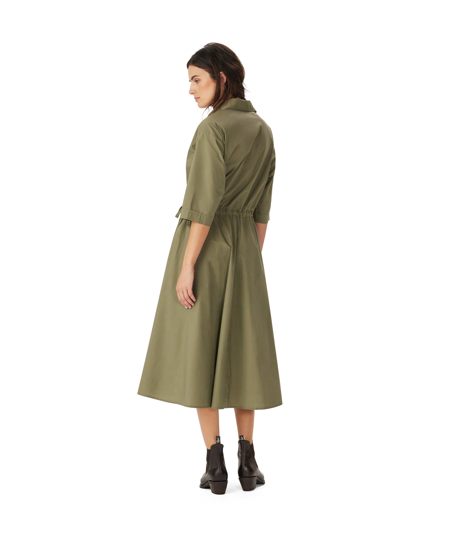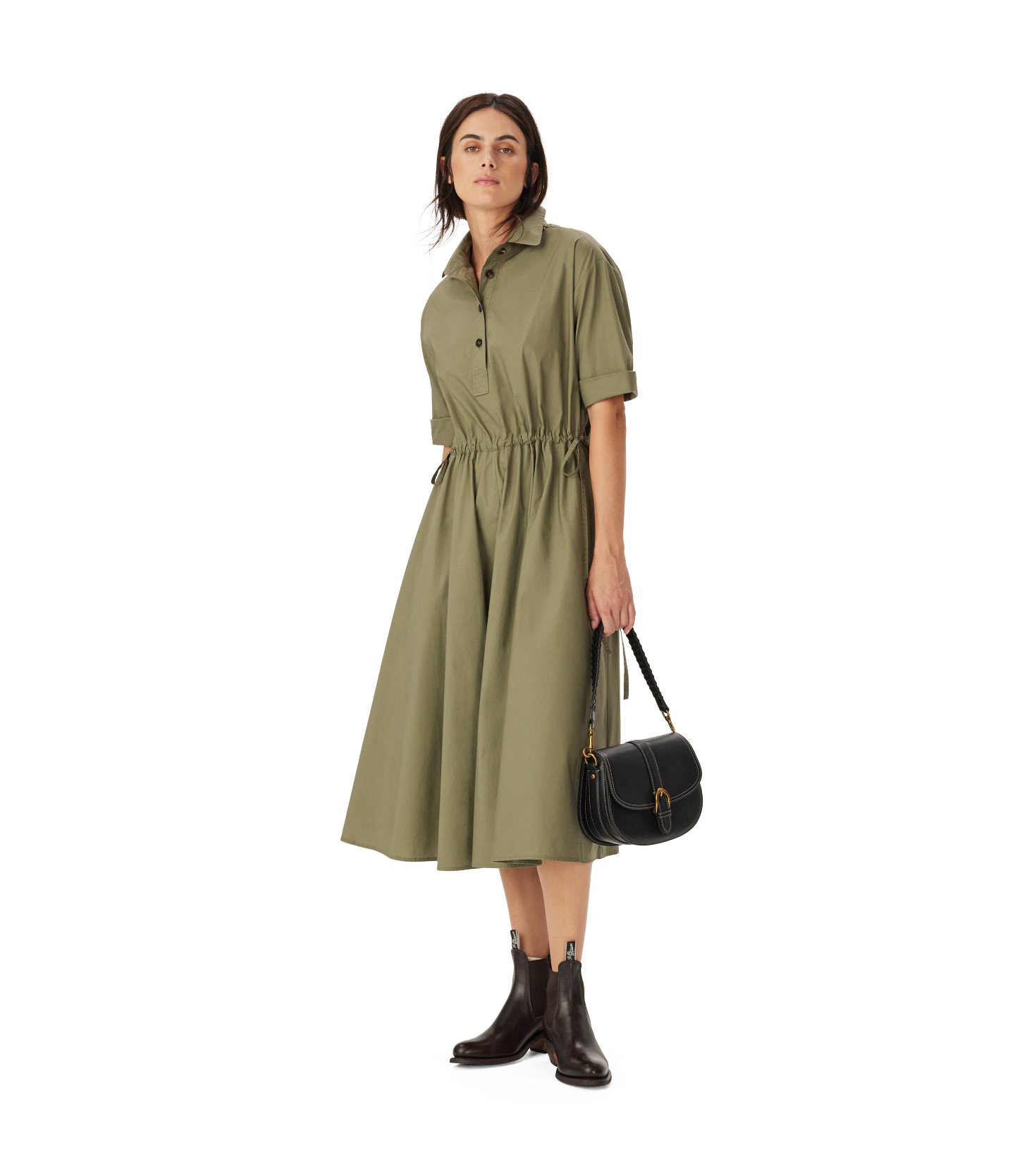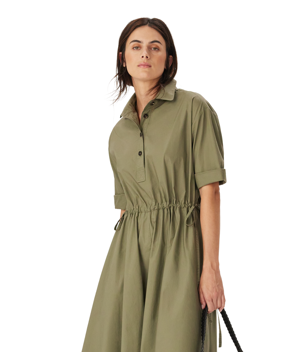 A versatile dress for work or daily wear, crafted from premium organic cotton with a partial button placket, tie gathered waist and discreet pockets.