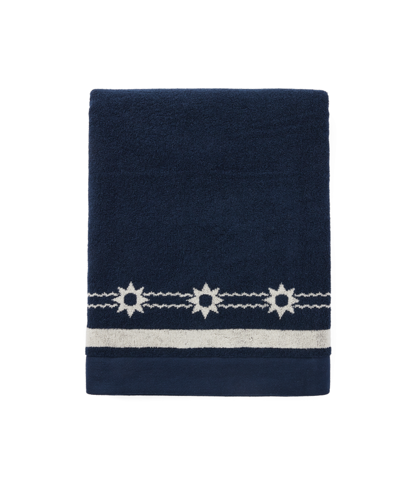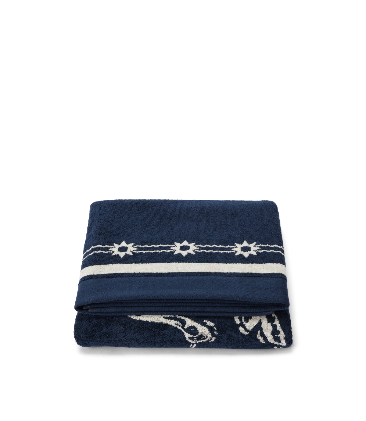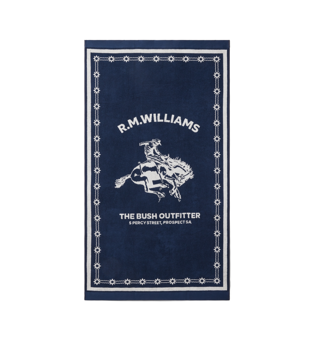 An oversized cotton beach towel, crafted for sun-drenched days by the coast. This style is finished with a Cloudbuster design in homage to traditional Australian rodeos. Organic cotton