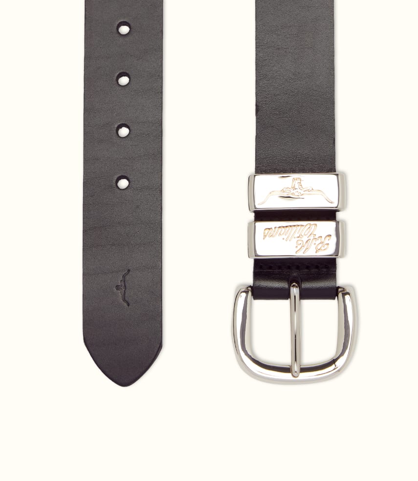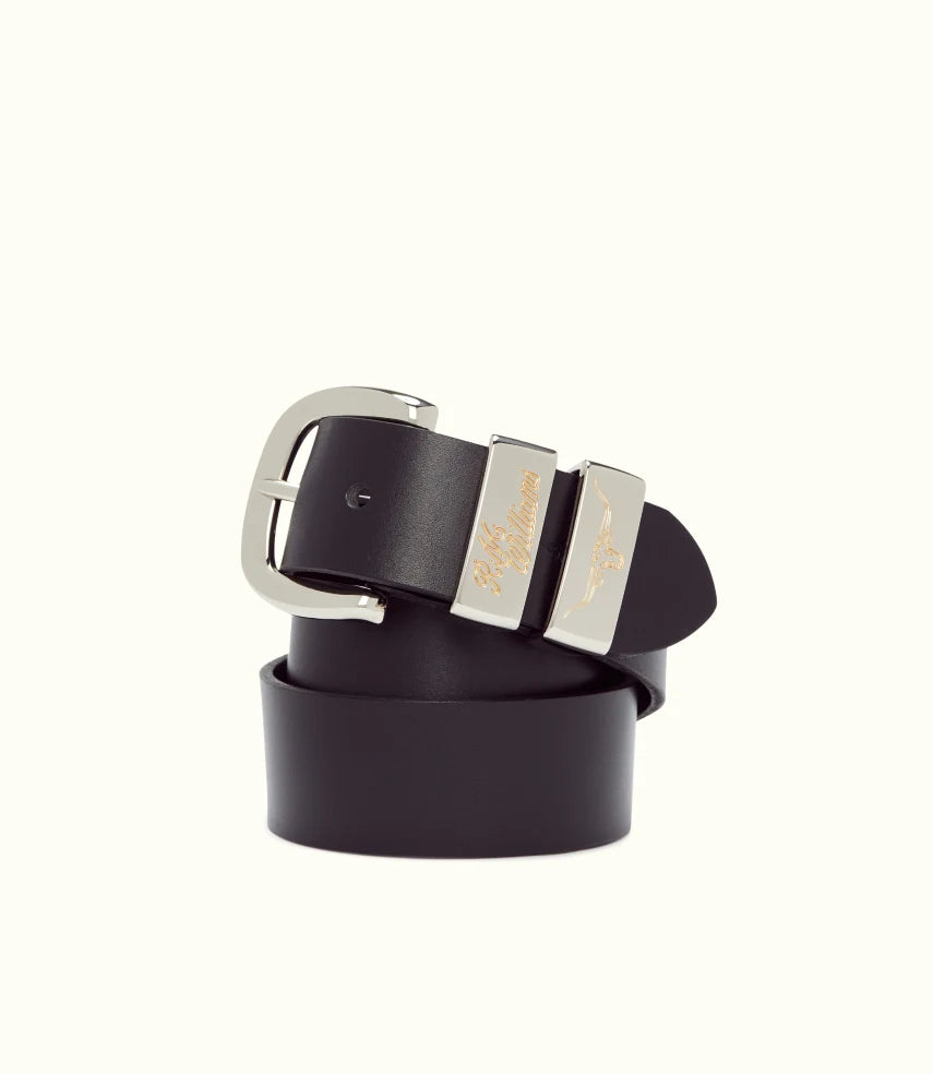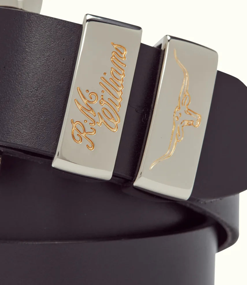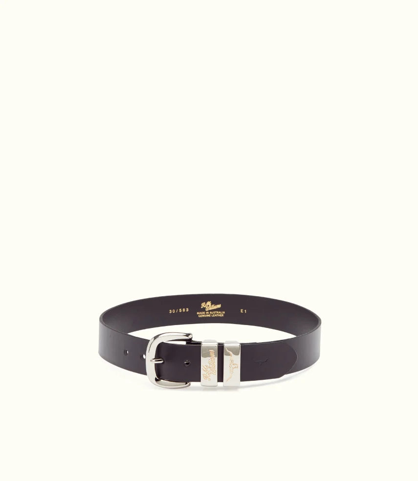 The Drover "Jerrawa" belt is handcrafted in Australian, made from 1 1/2 inch wide solid hide leather, featuring a 3 piece polished nickel buckle set with brass inlay.
