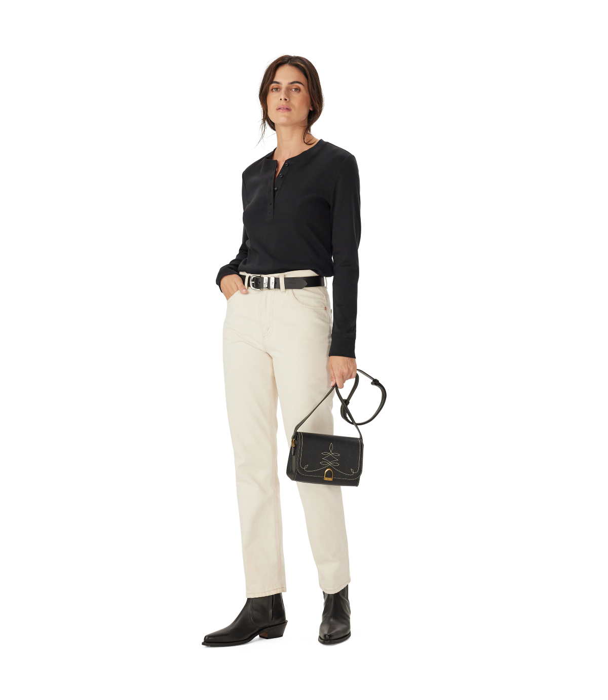 - Half-placket opening with branded button opening