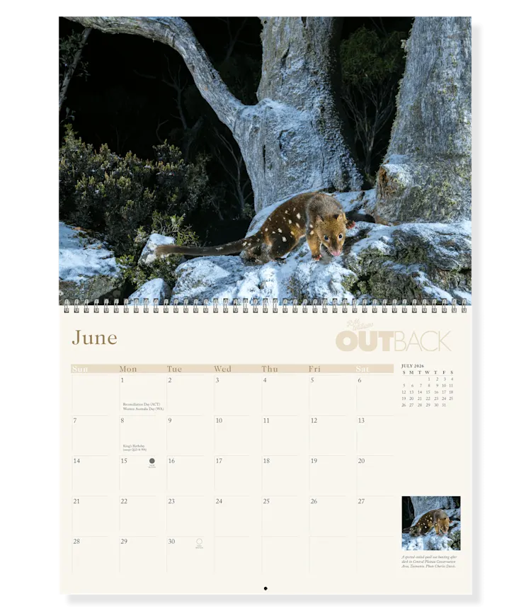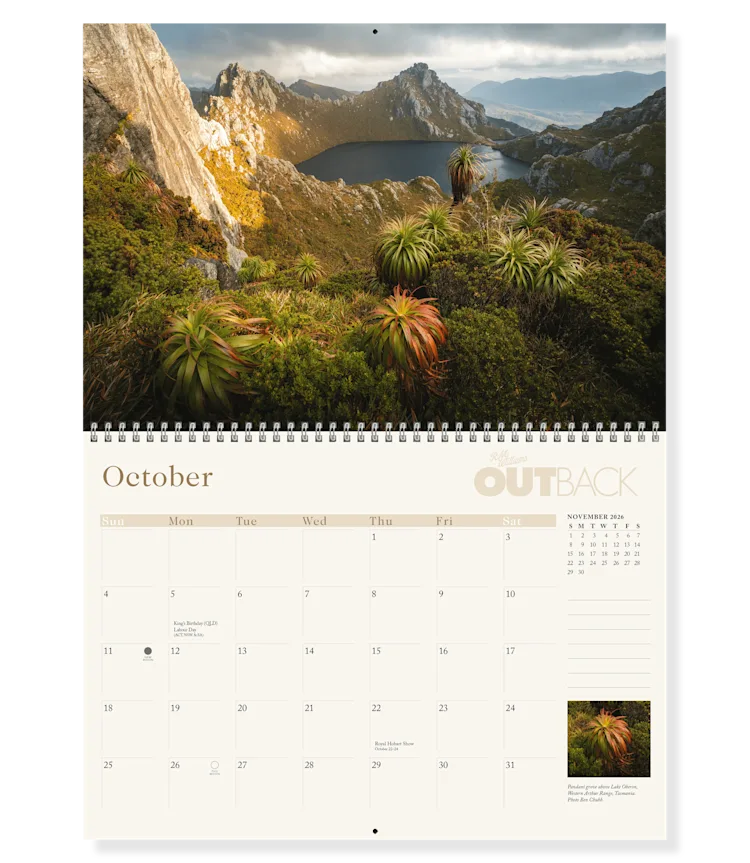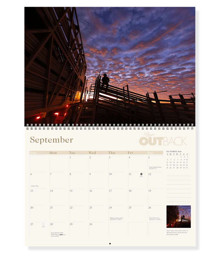 Adorn your wall with the stunning 2026 OUTBACK Calendar. Featuring the work of some of Australia's top rural and regional photographers, this year's selection of pictures is truly breathtaking. Calendar measures 350mm x 245mm and is designed to hang on your wall or noticeboard.