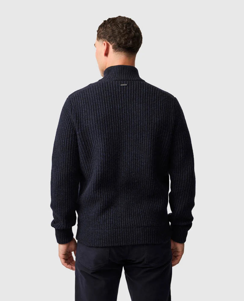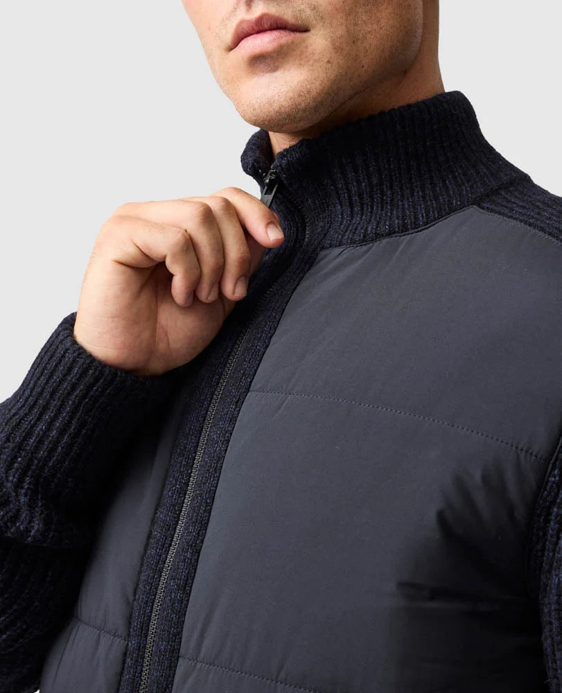 Designed for versatility, this zip-up sweater jacket features a high neck for added warmth. Wear it zipped up for a sleek look or unzipped for a more casual vibe. This new winter staple features fishermans knit construction with woven quilted front panels.